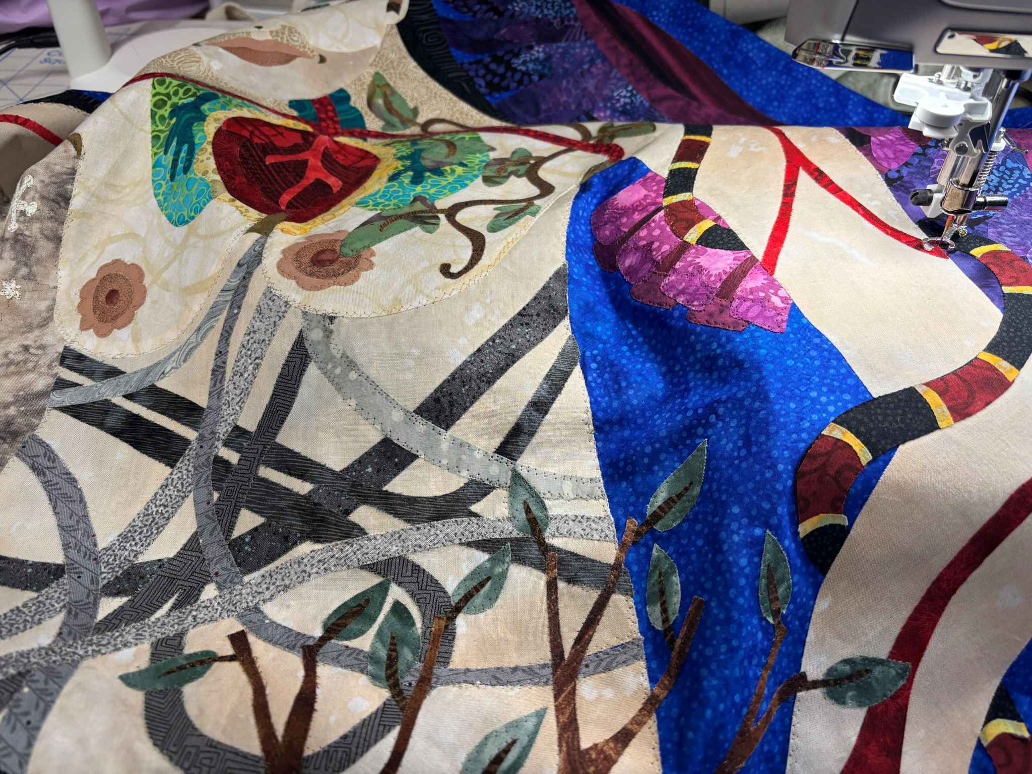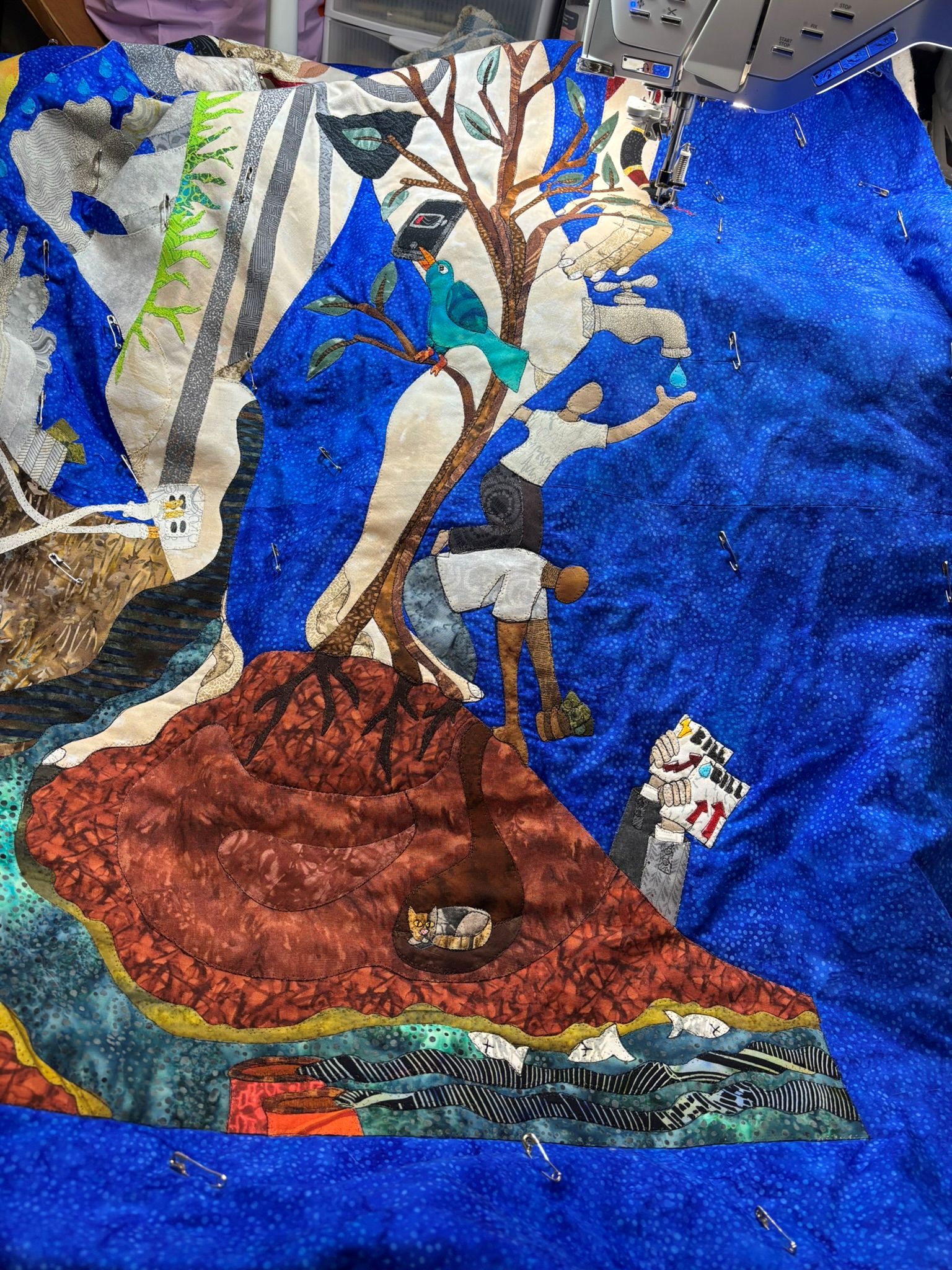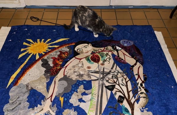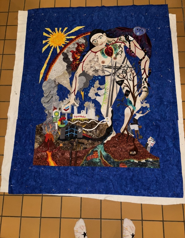 Meanwhile, the other show I was panicking about, because the deadline had moved up a month…it moved back a month to June again, so I have a little breathing room, but I’m still going through with bordering the dye paintings and working with those for that show. I already had my next quilt drawing copied when this piece had to shove in, so I have a plan for after…it’s not political, but I kind of need a break from those. I may feel differently when I get there, but my brain gets overloaded if I’m always working on a piece that is a mental challenge. Yes, the world is a mental challenge right now, but I also have a pretty challenging day job and I need to make sure my brain has some outlets that are safe. Besides reading…