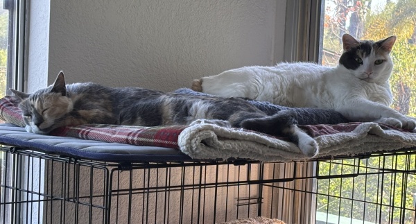 He only barked once at the neighbors’ pulling their trashcans in and once at the coyotes. By ‘once’ I mean he barked a bunch of times at each of those. After about midnight, he was quiet. Although the competition for lying on me was tense last night (3 of them, sandwiching the shit out of me).