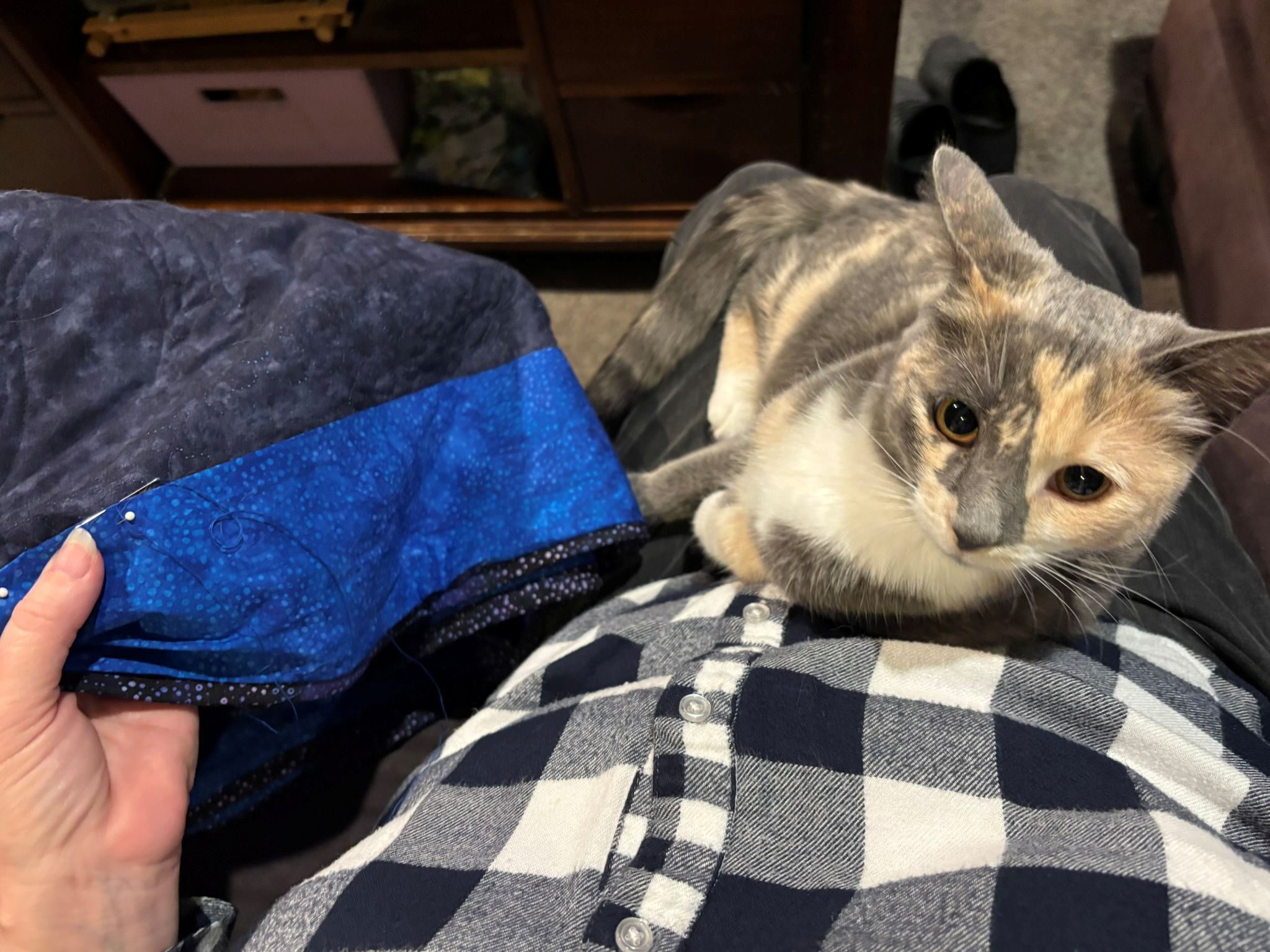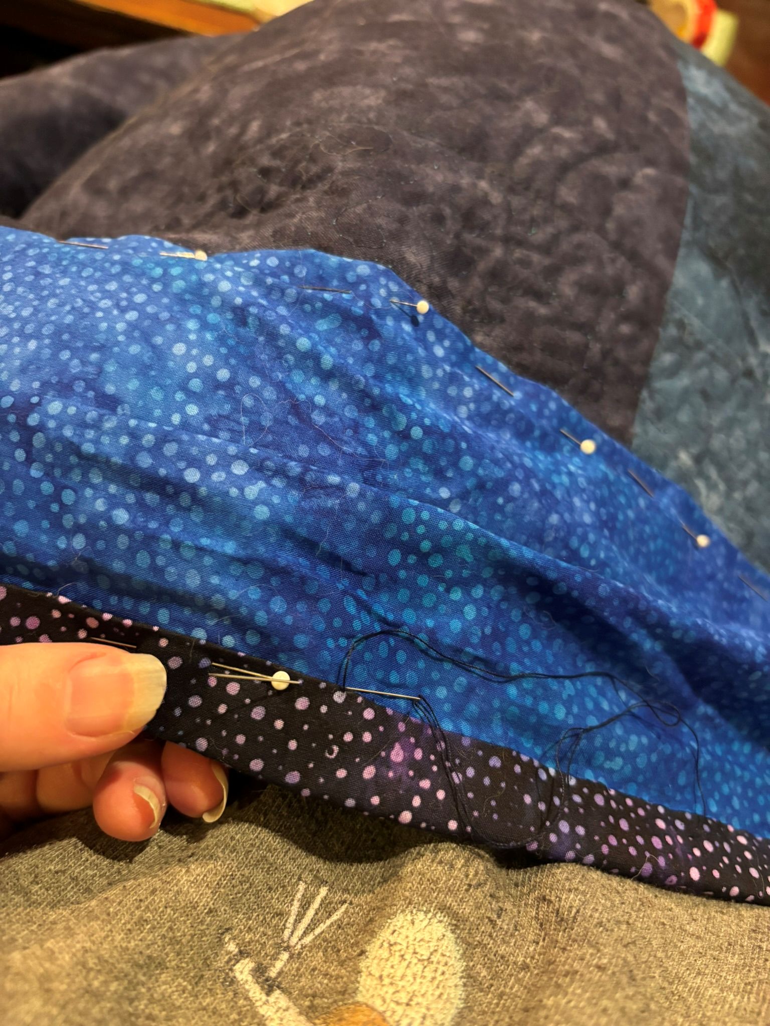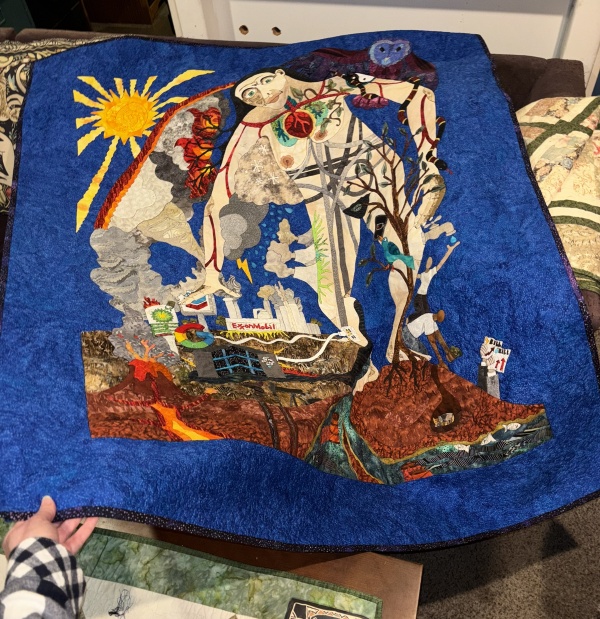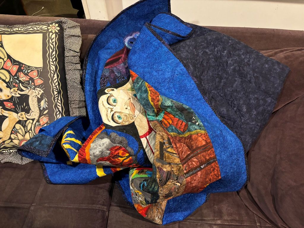 Also a great photo. With my hand in it and a pile of trimmed ends of the threads from the stitching. But it’s done! The first quilt of 2026. With the next ones ready to go…a departure from what I normally do, but I’m excited about that. We’ll see how it goes, how long the excitement lasts before I want to do something different. Or the same. It’s hard when I’m teaching to find the brainpower to branch out into different techniques and processes. I spend so much of my creative energy at school trying to plan and solve problems, that sometimes I come home and there isn’t much left. There are things I can do without a lot of conscious thought, like trace, cut things out, even pick fabrics…but the original creation, the drawing, that requires more thought. And these next ones, however many I do (I have four ready to go) will be completely different…well, not the first stages. Those will be rote…stuff I know how to do…but the later stages will be very different from what I’ve been doing. Excitement? And anxiety. Woo! I don’t know that I need more anxiety at the moment, but it’s creation anxiety, and that’s not always a bad thing. I guess watch this space?