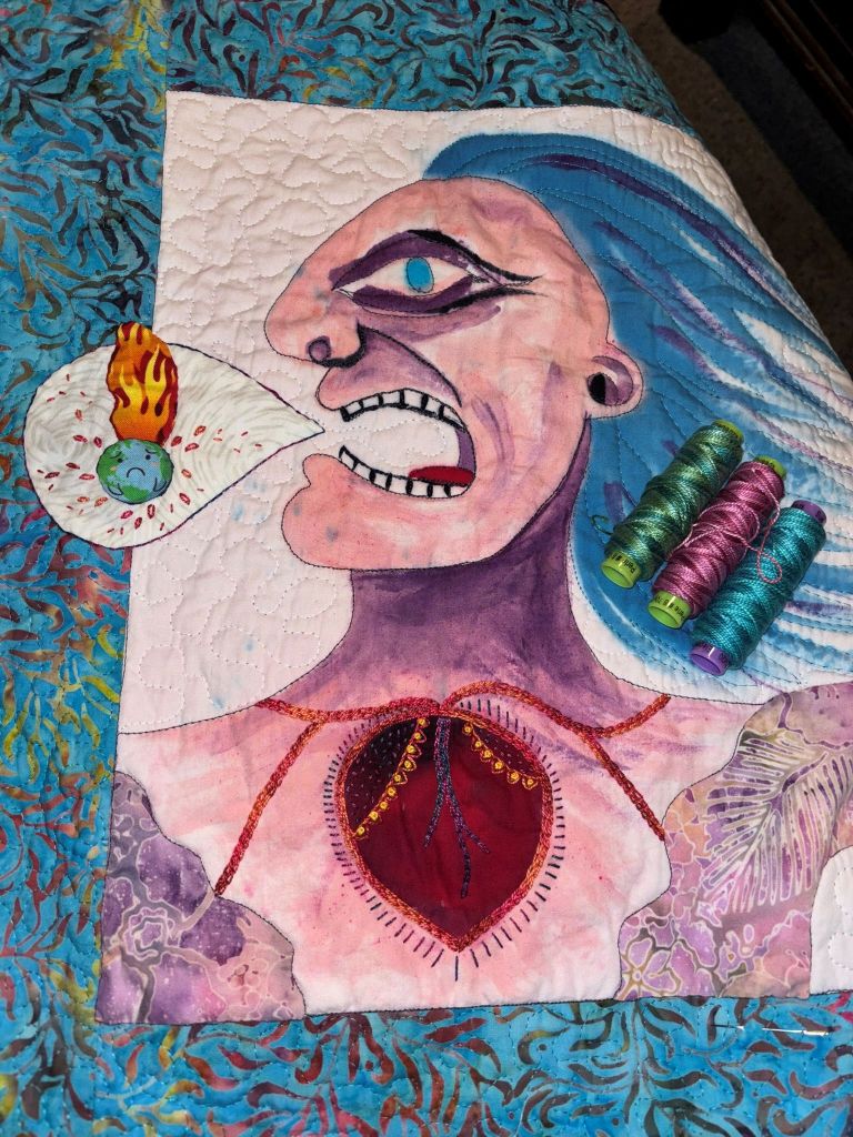 I have the closing reception for the Fantastic Stories exhibit at the Virginia Quilt Museum this coming weekend. We’re doing demos on Friday and then an artist talk on Saturday. If I had a car and more time, I’d then drive up to the Art Quilt Elements opening at the Wayne Art Center; I have a piece in that show as well. The opening is from 3-5 PM. It’s about a 4-hour drive from where I am in Virginia, I don’t have a car, and I’m planning on going to museums in DC on Monday. I’m not making it to the opening. I couldn’t do the 8-hour roundtrip drive plus rent the car. Money is tight. I’m appreciating the museum finding us a place to stay while we’re in Virginia and transporting us around. Saves me a bit of money I don’t actually have.