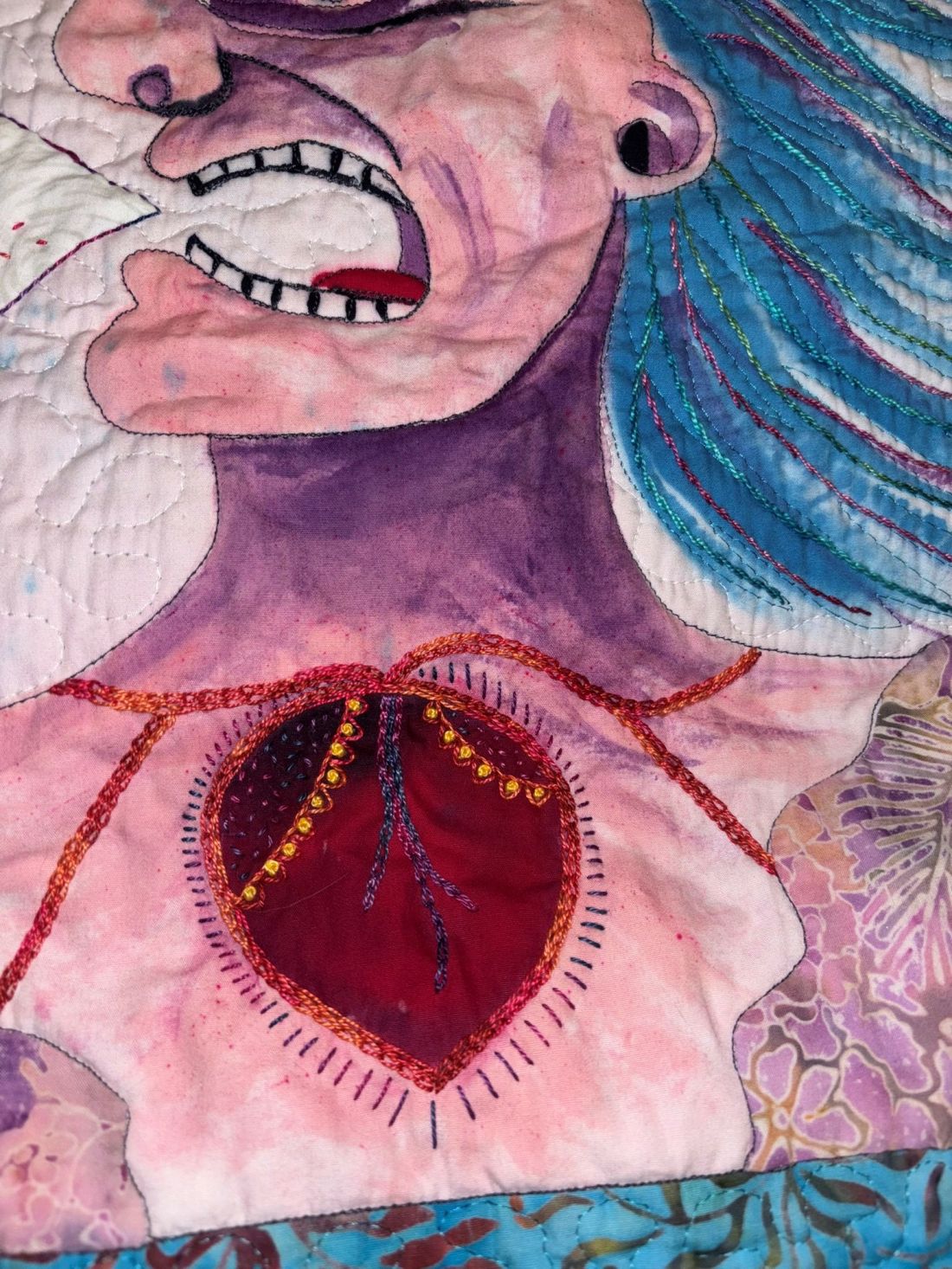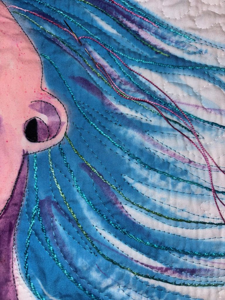 I did finish the smallest of the dye paintings last night. On Friday, I finished all the embroidery so far and was considering threads for the hair.