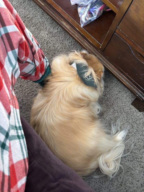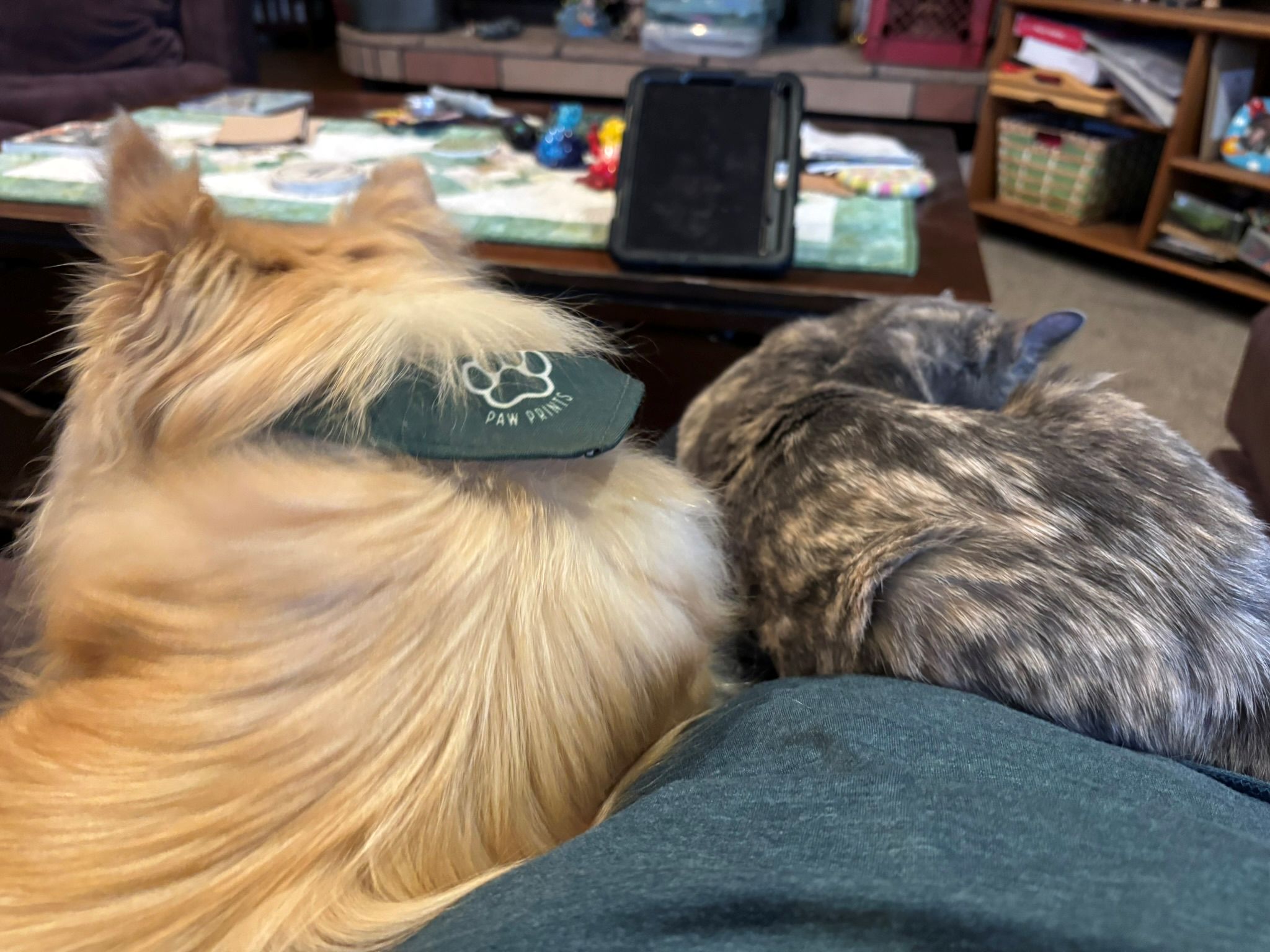 Usually this is when I read, but that’s my book on the table, so IDK what I was doing. Doomscrolling. Zoning out. Considering my options. The other option for Simba is to keep one of my feet warm.