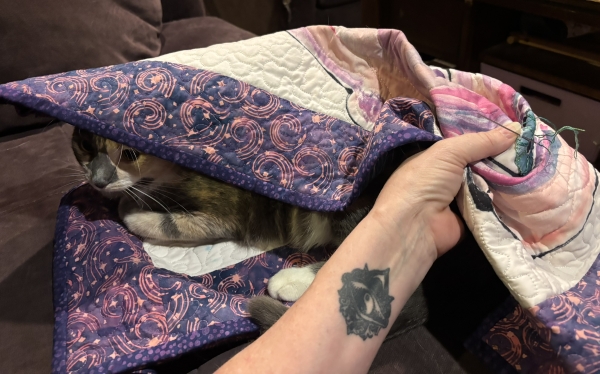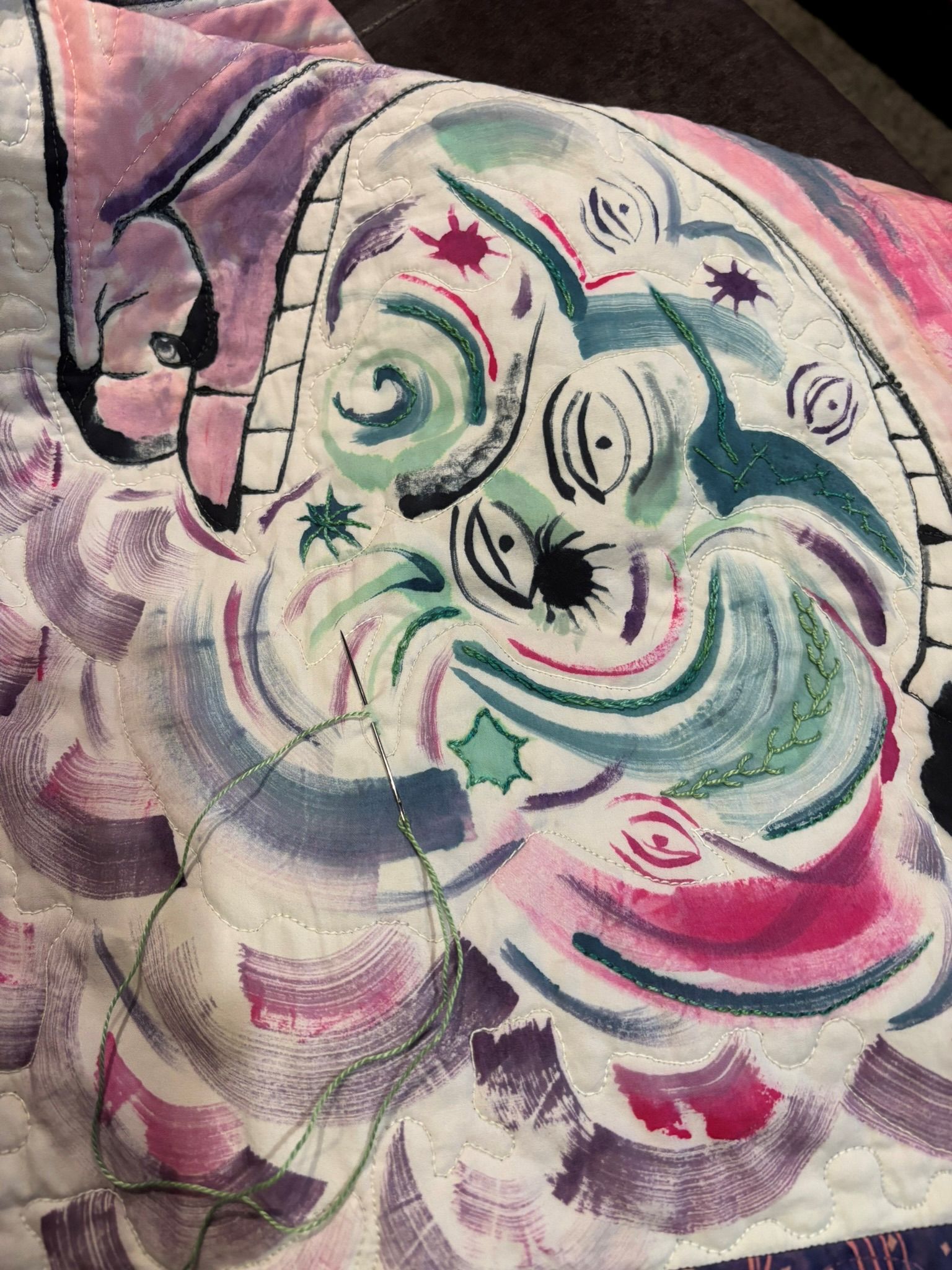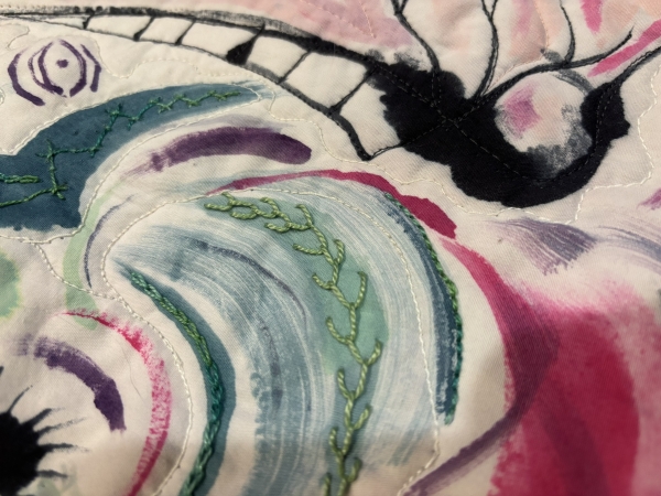 Artwise, I’m all over the map. It’s OK; I’ve been here for a while now. I’m working on embellishing this dye painting with Scribble’s help.