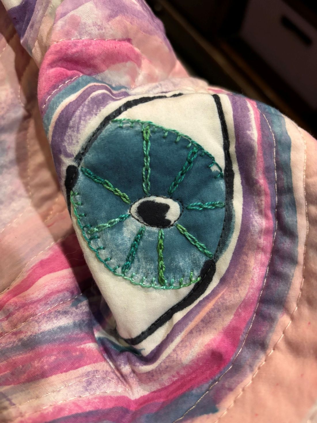 I’ve stitched two down and picked backings and found batting for all of them. Tonight, I’ll finish the stitchdown and start quilting. Some need more leg parts, but those are hand-embroidered after the quilting. Some of these from the previous make are on Etsy and some are at Visions Museum. Two of these are spoken for and the other three will eventually be on Etsy. Small brainless things right now…good plan. Although I need two more dye paintings done and photographed by June 1. Should be fine.