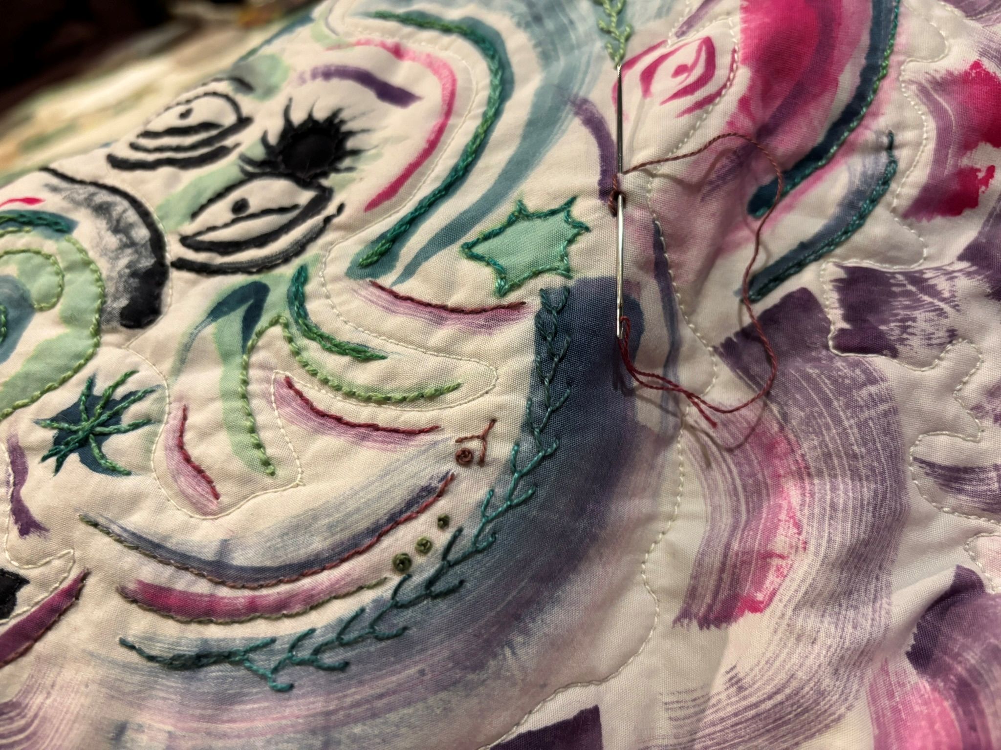 So quiltwise, I’ve been embroidering on the pink head piece…I just want to get it done.