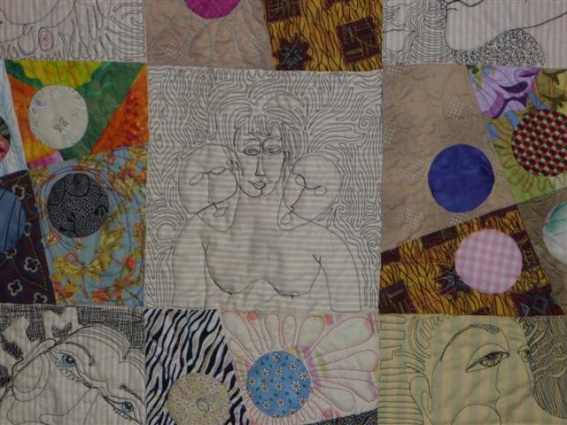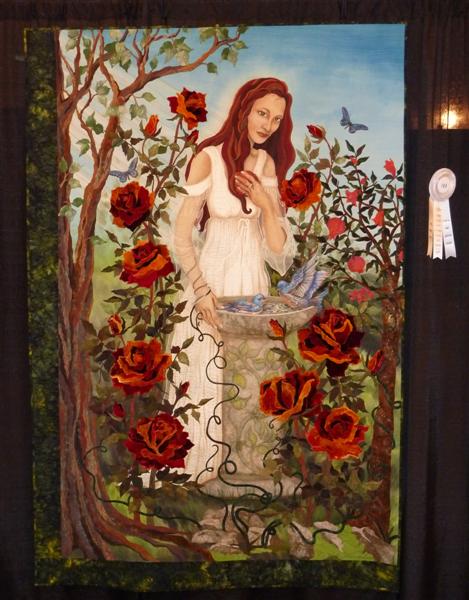 Hendricks was very successful with the painting of Persephone, and the riotous addition of roses adds to the complexity of the piece. I suggest you check out the detail shots of her other quilts on her website…her stitching is amazing.