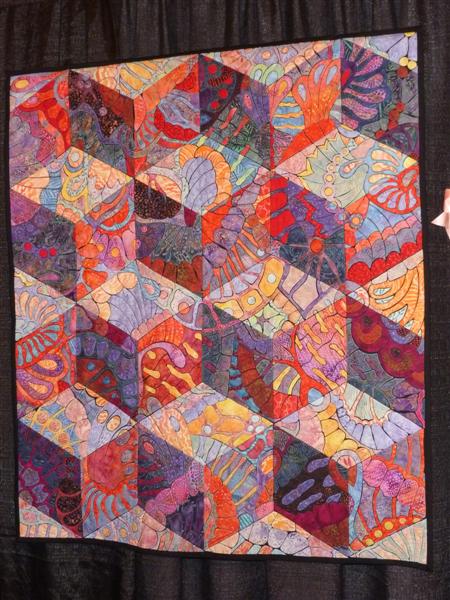 This quilt, Wings, by Rory Ross, intrigued me because of the work she did to make the tumbling blocks pattern overlay the wing pattern…