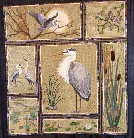 Kathy McNeil created Heron Happiness using applique and sashiko-style quilting on silk dupioni (which just for the record is gorgeous but crazy).