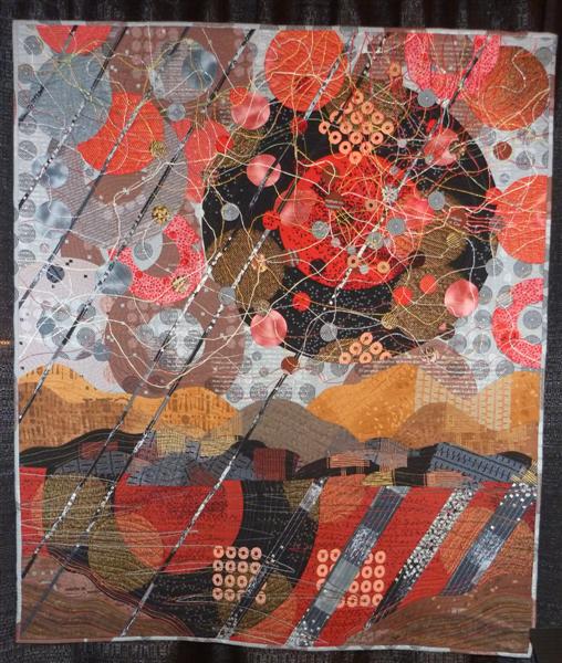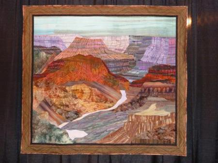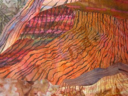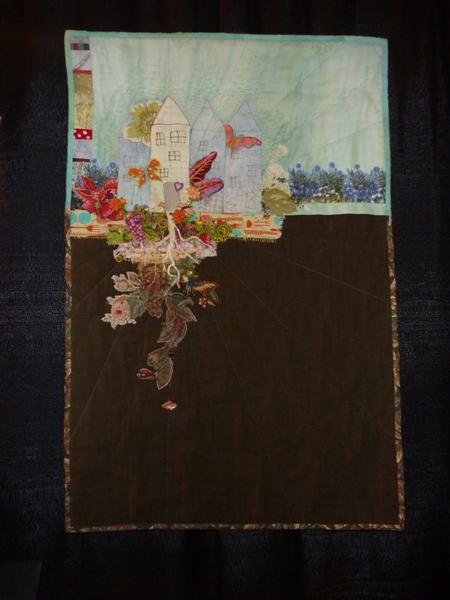 Apparently this is a fabric version of a painting she did earlier; it was done with Wonder Undered pieces and then machine-stitched with blanket stitch. Ross quit quilting in the 90’s due to back surgery and this was her re-entry…very interesting to look at up close.