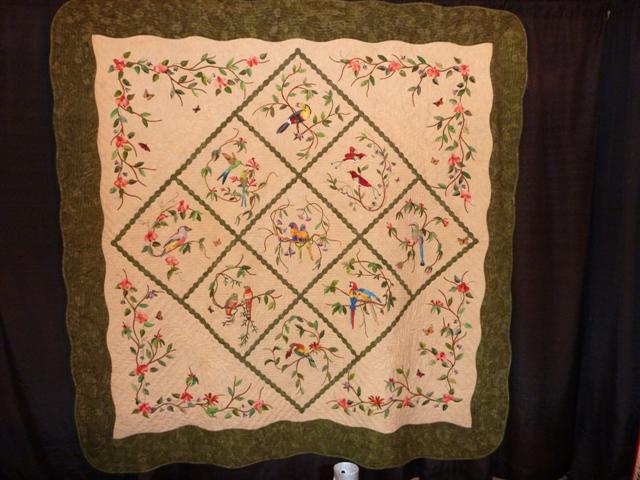 I do love hand applique, and the trailing vines and colorful birds on this delicate quilt are beautiful.