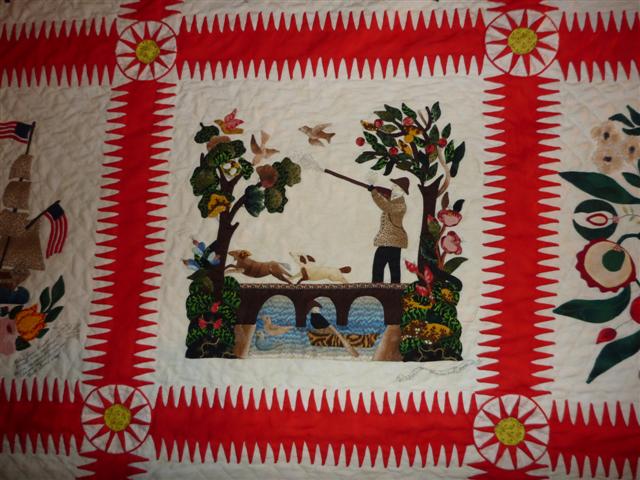 The detail in this quilt is also amazing…on her website, you can see some of her other nature-based quilts (although the interface may drive you crazy)…she wrote an article for Quilters Newsletter about creating her quilts from front to back in applique, so she can move the main focus around on the background and make sure the background doesn’t overwhelm it.