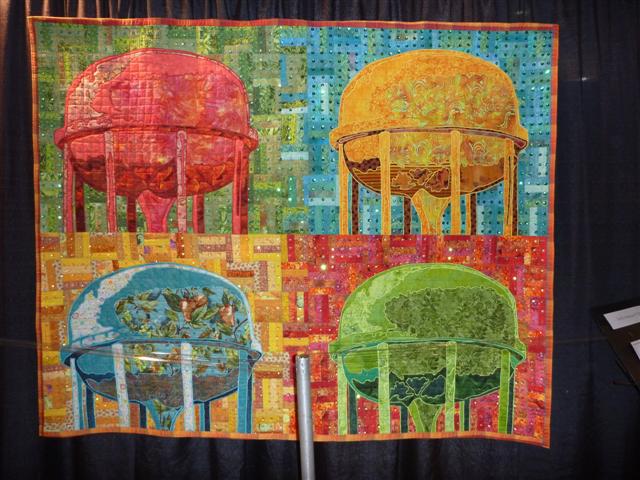 As Warhol did with Marilyn and soup cans, and Monet with his haystacks, Stern has focused on showing the water towers in all their sequined glory…in real life, this quilt sparkles. I love the bling associated with the object that so many of us ignore.