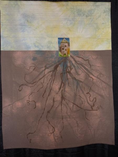 I own one of her smaller house quilts, and I continue to like the larger pieces as well…the sense of rooting the house in the earth and her use of negative space are both appealing to me…as you can see, because I also have a picture of her Rooted X…