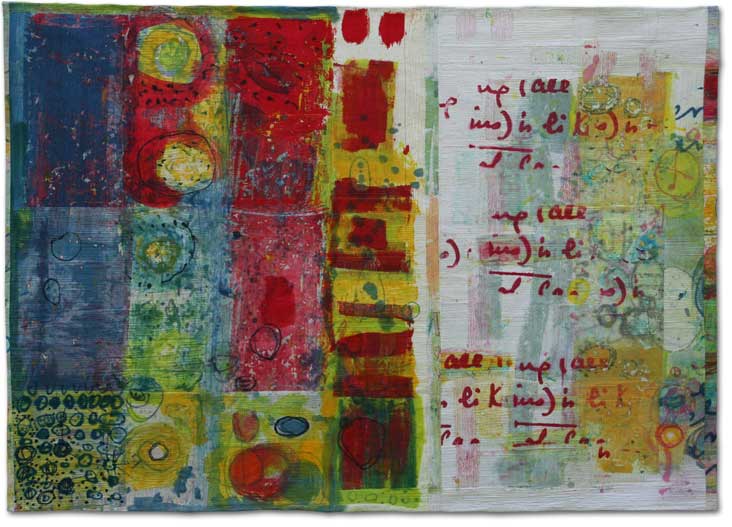 Vicki L. Carlson’s piece Worlds Apart is also going to be in the Art Quilt Elements exhibit, so here’s your chance to see it before it wanders off to the East Coast. It’s an interesting piece that has been dyed in overlapping circles of color. I can’t find a website for her, but her piece is currently on the main Interpretations page linked above. I actually like it better from a distance, as it looks like the overlaps are more sheer and multilayered; close up you can see that it’s all one layer.