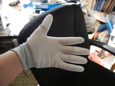 OK. That’s not how you spell it. But this is what I use when I quilt to help me grip the fabric and move it around. I’ve tried other things, but these hurt my hands the least and work the best for me. I love it when they’re clean. I do sometimes wash them, but eventually the grippy part on the fingers wears off and I need new ones. Soon after I started, Kitten did this.