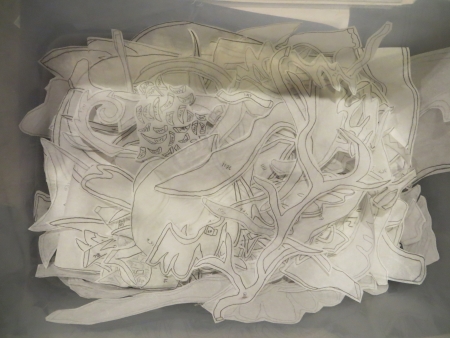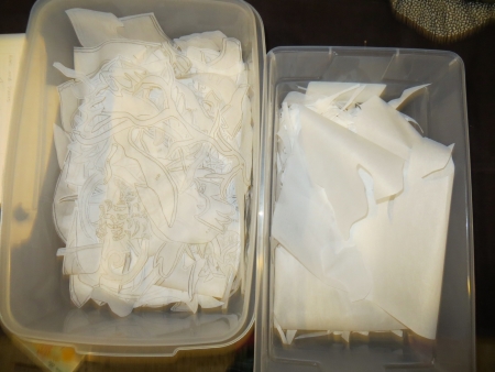The one on the right is all the trash and leftover pieces. I don’t throw it away until I make sure I didn’t drop some real live pieces in there (because I do). Plus I have some where the web is releasing from the paper, so I might need to redraw/recut those, so I just hold on to that box until they’re all ironed down.