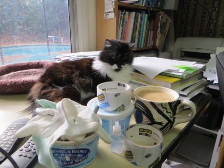 A roll of packing tape for picking up hairs before I quilt over them, best I can. I remember going to the mountains once and forgetting that. Big mistake. Had to pick out all those hairs by hand. Pain in the ass. So the number-one use for packing tape in my house is not taping up packages…just so you know. And mostly at the moment, it’s because of this beast…