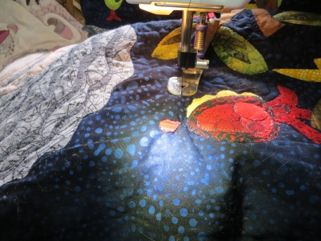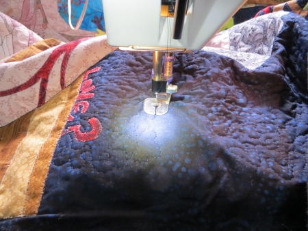 I did Quilting Impossible today: dark navy blue thread on dark navy blue background, right eyelid still twitching off and on, bad blinding light coming and going from cloudy day to sun, crying intermittently, blocking all necessary vision. Really stupid. But eventually it got me out of the stupid place. Remember how I said Sunday was going to be mean to me, fight me about getting art done? That’s why I quilted this morning…