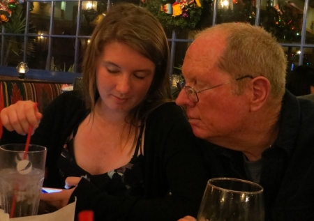 Grandpa and girlchild calculating tip. Math at the table. Boychild and I tried to find a geocache outside the restaurant afterward (yes, there was one), but we were unsuccessful. It was dark. Made it more difficult.