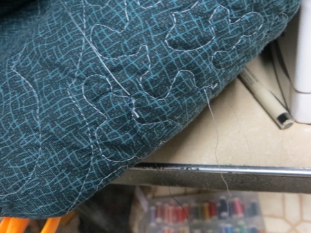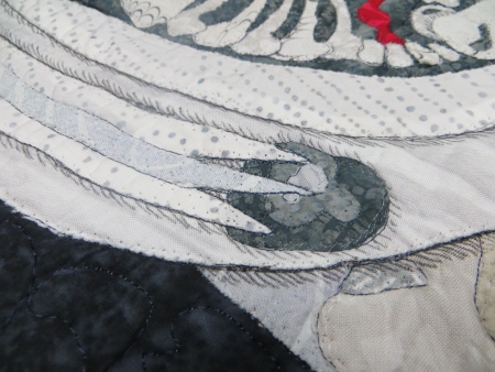 And I did. And no, it’s not in the catalog. I’m OK with that. It’s not a lot. It’s just enough. If I had been in a different mindset back in August/September, I would have handled the last stages of this quilt completely differently…there are things I would have done that would have extended the finish time by a month probably, inking and embroidery and maybe even beads, but I just couldn’t. I associate this quilt with the worst of my depression, with the three weeks of shock and the craziness after that. I did NOT want to spend more time with it then. So I found mistakes and problems when I was cleaning it up today…I fixed a few of them…but then I made more mistakes when I was trying to get it cleaned up…I actually ended up ripping out stitches in the background by accident in two different places. LAME. So I had to fix those.