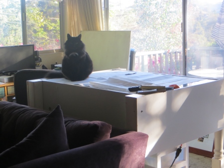 When I left for school this morning, Midnight was sitting on the light table, right on top of the drawing I’m tracing, staring at me.