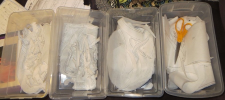 There it is, all sorted out. Isn’t it cute? It only took up 4 bins, instead of the 13 I needed for the last one. Goals? Get this ironed onto fabric, cut out, ironed down, maybe even stitched down by Spring Break. Break is really late this year, starts April 5…so I have 6 weeks. Then I need to start drawing the next invitational quilt…can’t talk about that one yet. I guess I will start drawing it when I finish this crazy one. Then I’ll need to decide what big one will occupy me for the next few months. The mammo one won’t take long. No down time. Down time is DOOWWWNNN time. Yeah. Moody. Stupid fucking hormones. Stupid woman existence. Sigh. I don’t really hate being female…but it’s not a whole lot of fun at the moment.