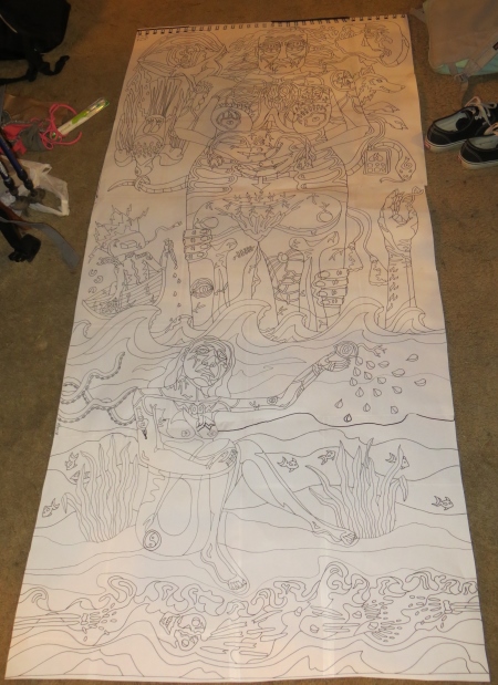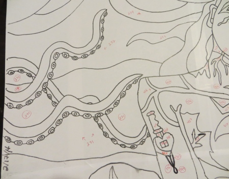 I made it through the 500s somewhere about a 1/3 of the way up the drawing. You can see the thicker black lines where I had to transfer something I had drawn on an overlapping piece between two pages.