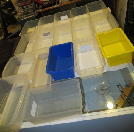 I lay the bins out on my light box (although I had to add another one here because I had forgotten the zero bin, for pieces 0-99. I always forget that bin.