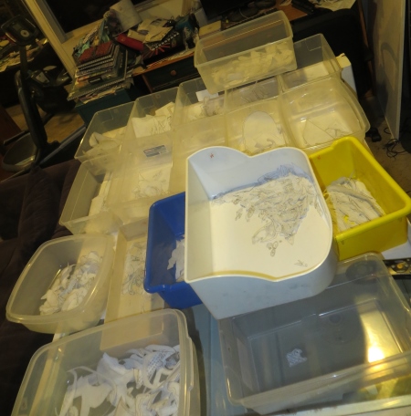 Then I had to find enough bins to sort the pieces out into 100s. That was more difficult; I’m not sure why. I think I’ve filled up more bins or something. Not sure. Technically, you need 18 bins to sort over 1700 pieces, but in the end, I only needed 17, because all the pieces with numbers in the 1700s were the same color as pieces in the 1600s (that damn octopus), so they were all cut out as one piece, to be cut apart when I iron them down because they are that damn tiny.