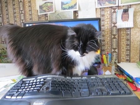 Many times, when I sit down to work at the computer, there is a black cat behind me on the chair, but sometimes, if she’s in a mood, this is where she is.