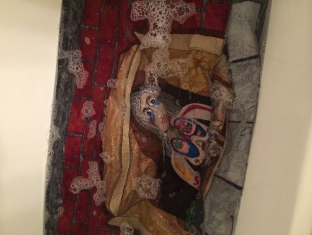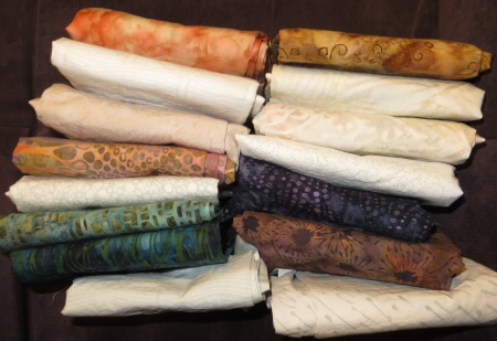 Which reminds me, the quilt I sent up to San Francisco area had to be washed to try to get rid of cat dander. I’m hoping I was successful, but there will be only one way to know for sure. I washed it at my parents’ house, because they’ve never had a cat there…I was fairly sure it wouldn’t run, just based on the fabrics in it, but you never know for sure, so I was a little freaked out…but I know how to deal with running fabrics. So I put a little Ivory soap in water that was a little bit lukewarm, but not much. I agitated it a little by hand, and what was interesting is that the quilt was actually dirty. It has hung in about 8 or 9 exhibits, so that’s not surprising I guess. I don’t usually wash my quilts, though.