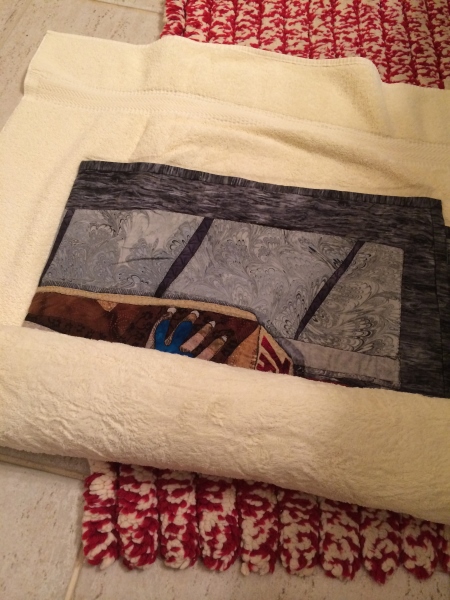 Then I found all the light-colored towels I could and rolled the quilt up in them one at a time and squeezed the water out (remember doing that with your sweaters that needed hand-washing? Same deal).