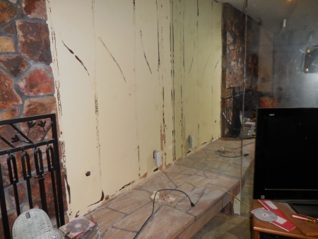 After telling Dad about 5 times that no, I did not want him to saw through the screws, thus leaving big metal pieces poking out of the stone of the fireplace, he and the boychild and I manhandled and pried and pulled the damn things off with pure brute strength (I am a beast at times, yes)…and then went after the paneling, which turned out to be two layers of paneling (which was better than more mirrors, which is what we found behind the first set of panels).
