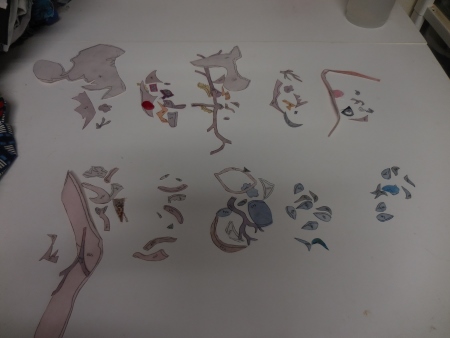 That human figure in the middle actually has almost 200 pieces in it, I realized today. And when I numbered it originally, I forgot to number the face and hair, so although the body runs from piece 316-469, the face and hair are in the 1200s box. Hmn. The view above is the other direction from where I usually photograph the ironing, so you can see how small the space is for my butt between the ironing board and the table where I lay my pieces out. There’s a lot of stuff in this room. Scares me sometimes.