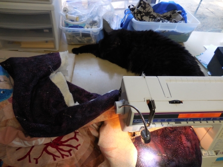 See Midnight behind the machine? I just draped the quilt over her and she would occasionally twitch, but she wouldn’t move. Whatever. Remind me again why sleep is so important?