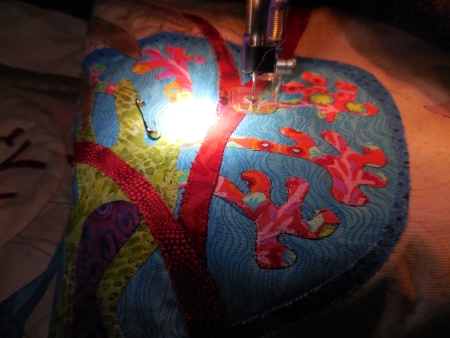 This thing has about 4 hours in it at the moment (quilting, that is). I probably have another hour at most of outlining to do, if that, and then there isn’t actually much background quilting. The image pretty much fills the space. I’m hoping to finish early tomorrow so I can get a binding on it and move on to quilting the next one. That of course presumes that I have an appropriate binding fabric for it (I’m pretty sure I don’t). Road Trip! To the fabric store. Which is a whopping 5 miles away. I’ve been good, though. I haven’t gone for a long time.