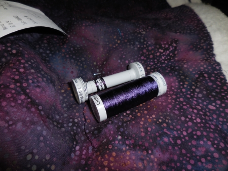 So here’s the deal with purple. It’s a pain to match. Yesterday was about two hours of trying to match purples and either giving up and going to an entirely different color or making an effort and getting the same purple. I actually had three or four dark purples that I thought might work, so I started with one, and then I got this bad feeling (my poor stomach yesterday), so I stopped, pulled the quilt off the machine, and went to find some real light. Out on the deck. In the sun. Yeah. So that was not going to work. It was too blue.