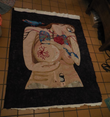 But if I finish her today, she’s a July quilt. Otherwise, she’ll be an August quilt. Probably gonna finish tomorrow. I’m still significantly behind my original schedule for this week, but that’s reality for you. Slaps you upside the head. And then I meditate through it. Because none of it really matters. I’m glad to have this one done. A year and a month from drawing to finish (there’s reality again for you). Got tons of stuff in the mix at the moment. It all wants to be made, and since the rest of my life is such a clusterfuck, especially with school LOOMING the fuck around the corner again (funny how that keeps happening), I need the art to be the balance. Last year, I took very little work home on a daily basis. I made art almost every fucking day, even if for only 30 minutes. It saved me. That and Brussels sprouts. And my kids. So that’s still on the table for my sanity.