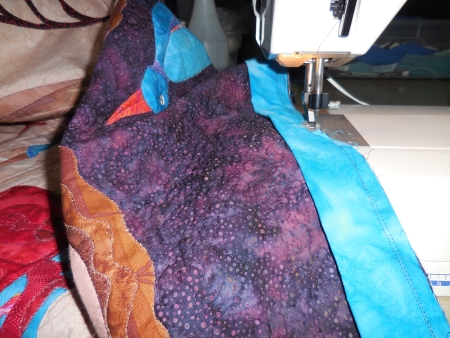 Then I came home and decided to use the turquoise fabric I had lying around from when I did the bird quilts. It’s OK. I can use the other turquoise for something. It’s that standard Turq Batik color, but the one at home was darker and slightly…um…stronger. So shopping for binding? Waste of time. It was here. That is ALSO a metaphor for life.