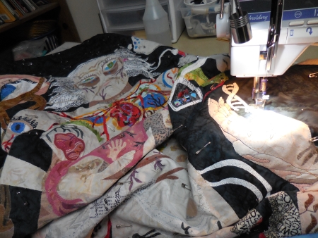 This is what it looks like all piled next to the sewing machine…it’s a really LONG piece, so shoving parts under the machine to quilt in the middle is a pain in the ass.