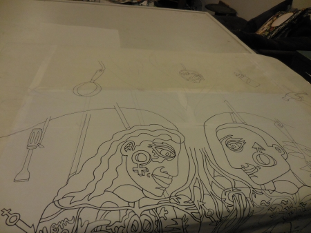 When I’m drawing to size, it’s really better to NOT be using a lot of white-out. It’s hard to see through all those lines when it’s upside down on the light table. So the bird had some loosely drawn pencil lines and then I went in with the Sharpie and drew it final. I don’t follow the pencil lines exactly…they’re just a guideline. And I was looking at some of my old bird drawings for this one…but I had to really fight the desire to add more detail. Because it needs to be done by mid-November and there’s already a fucking shitload of detail on it.