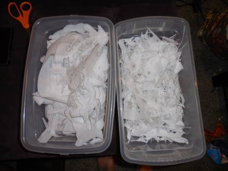 So I’m done with that heinous task, the cutting out of 1070 pieces of Wonder Under. Total, it took 7 hours and 23 minutes. I’m noticing my estimates are fairly accurate in terms of hours, but not so accurate in terms of days. I think that’s because I overestimate my ability to blow off everything else. I forget about sleeping and eating and peeing. That shit takes time. It took me 5 nights. I did 3 hours yesterday. The shortest day, I did 40 minutes. Last night, I had quilt class, so I cut out for an hour and a half, and then I came home and decided I wasn’t going to bed until I was done. I even thought, only briefly though, that I should sort them all last night too, but I decided that was crazy talk. Because it was. It was after midnight when I finished.