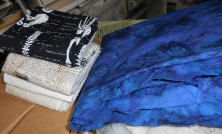 Yes, I also bought some other fabrics, some light/whites for eyeballs and fingernails (seriously) and two Halloweeny fabrics with anatomical hearts and skeletons and the like. I thought Rosie’s looked pretty empty of fabrics…maybe because Market is coming up? I don’t know. Lots of empty shelves. It disturbed me. I’ve been going to Rosie’s since I started quilting in 1987. That’s a long time…and yes, it’s my favorite San Diego store. There’s a quilt store closer to home (it’s actually moving further north, but will still be about the same distance) that I rarely frequent. It’s not got a lot of fabrics. It caters to class-takers, those that like to buy rulers. I only have two rulers. Actually, I think I have a couple more than that, but only because people give them to me. I’m still using the same two rulers I’ve had for probably 25 years. I don’t cut a lot of straight lines. I don’t take any classes really either. At the opening last week, someone offered me a brochure for a local art facility that does classes, and I’m thinking, um, yeah, I’m kinda past that stage. I might take a mural-painting class or a graffiti class at this stage in my life, but I don’t need to do a whole lot else. I’ve already done it.