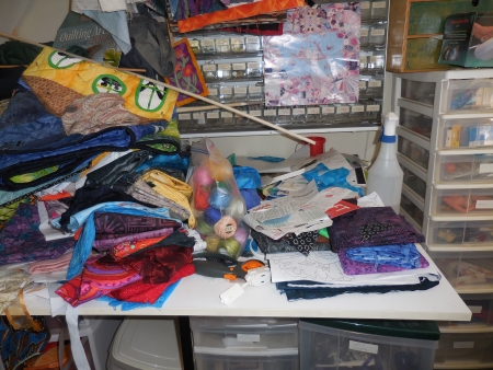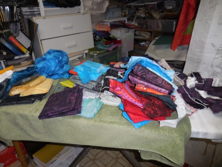 (moved from one place to another…very efficient) and then later got them into piles by color and realized I have way too much fabric at the moment. I know that doesn’t make sense. I do keep buying fabric, but I don’t buy a lot at a time, and mostly it gets used up in backgrounds and backings and bindings and sleeves, but apparently I’m still adding more than I’m subtracting…something to do with how little of a particular fabric I use at a time? Or they are breeding.
