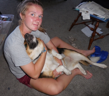 and because apparently I have to have something underfoot and Calli was at the other house, Katy stepped up and laid her chubby little body out for me to step over. She is pretty mellow, though, and will not freak out when I step over her. She will follow me out of the room 700 times though if I leave to get my tea or pee.