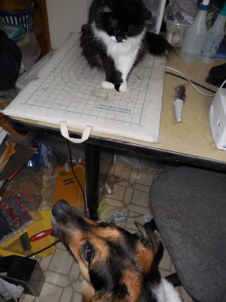 Katie and Babygirl are not currently friends…this standoff was while I was trying to iron, with Katie standing right where I need to be. She won’t move when you tell her, or at least, she won’t if there’s a cat involved…so I have to physically pull her out of there.