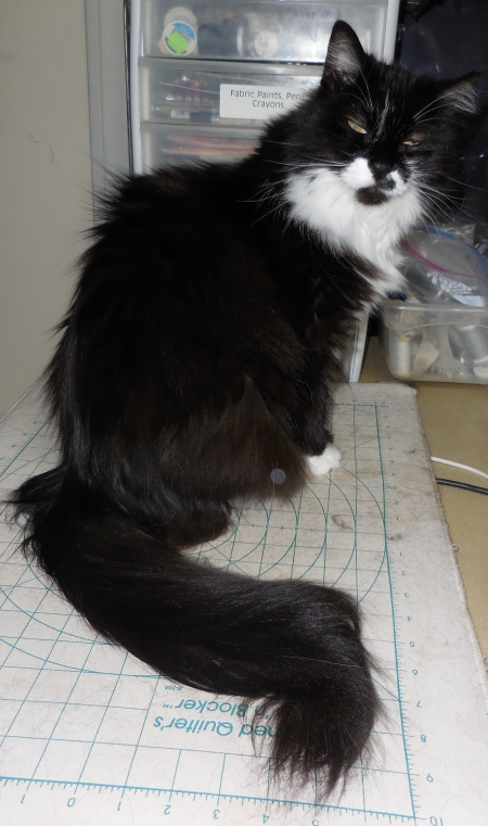 Who has an issue with this cat, because she talks back. The other two just ignore her or run away. Katie’s funny because she doesn’t understand the words “move” or “out”. She just stands there staring at me, and I have to grab the collar and try to budge She Who Does Not Want to Budge. Plus she can’t figure out how to go out my back door without headbutting the door or wedging her shoulders in the doorway. I start to open the door and she runs at it, full bore, like a battering ram, so I’ve taken to standing in front of the opening as I’m opening it, just to get it wide enough for her to fit out. She does stop before she rams into me. Usually.