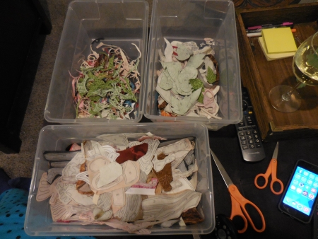 Top left is trash (kept until I figure out if I threw any tiny pieces in there by accident. I do it all the time, unfortunately.). Top right is what I’ve actually achieved (which yes, doesn’t look like shit at the moment; thank you for reminding me.). Bottom is what I still have left to do. Two pairs of scissors, the phone, wine, TV remote, and pajamas. Really, it was not a bad night, except it started with a soccer parent meeting (aargh. asshole coach. stupid people. grrr.) and I didn’t get to go to the gym and I was really really tired. I’m hiking tomorrow morning, so I’d really better put myself to bed early. If I’m smart. And we’ve already proved I’m not, at least when it comes to sleep.