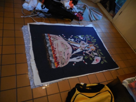 This one is smaller on purpose…had to get done quicker, plus the gallery is relatively small and my work tends to be bigger than other media. I had to get up early because the plumber was coming at 9 to deal with the toilet that hasn’t worked for a good long time (turns out it was a nasty long living root) and I had to be at school at the same time. Our school staff donated over $1000 to a few needy students, and this morning, we delivered food and presents to 4 families. I was in charge of drawing/sketching supplies for a 7th-grade girl, so that was easy. I can always find a sketchbook and some stuff to color with. So the only time I was guaranteed to get it pinbasted was early. So I did. Because that’s the entryway floor and so you can’t have people coming in and out while you’re pinbasting.