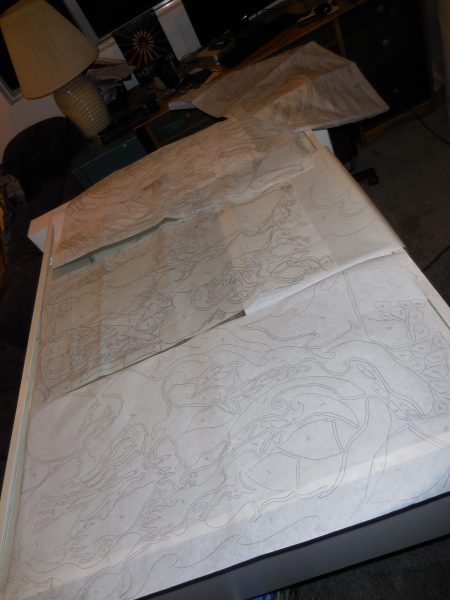 Wonder Under dreaming…ten hours and 37 minutes of tracing Wonder Under, around 900 pieces (I didn’t number all of them, shockingly). I did the whole thing under the influence of pneumonia and rib-rattling coughing…starting February 17 and ending last night. I was obviously well and truly ill from the 19th through the 22nd, because nothing happened.